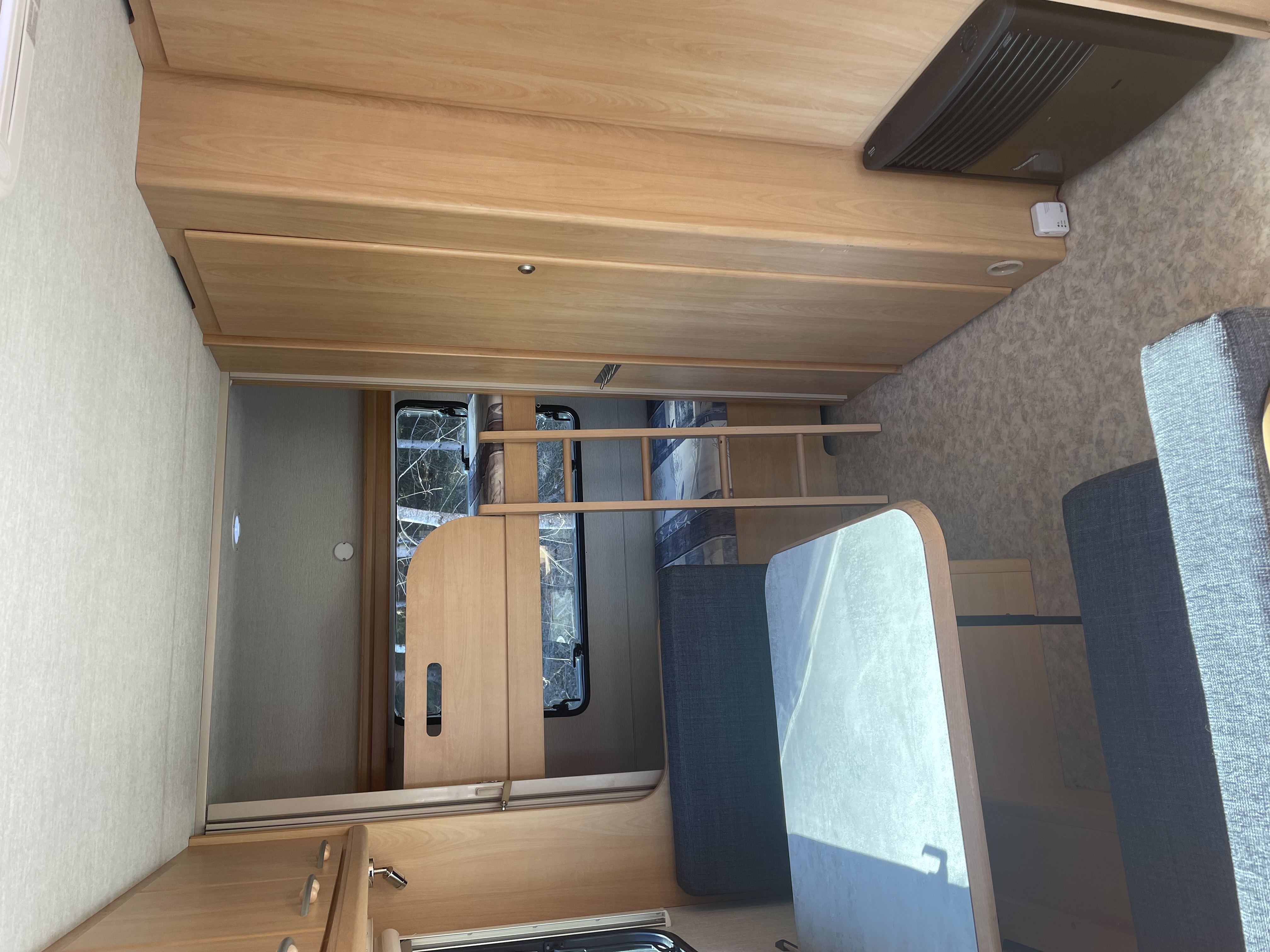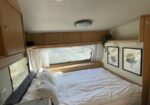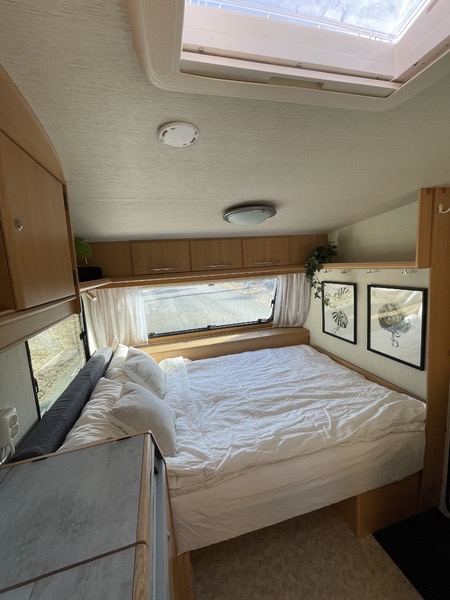Dubbelsäng med resårmadrass och bäddmadrass, våningssäng och en soffgrupp som kan bäddas ner till ytterligare en sovplats. Toalett finns i husvagnen.