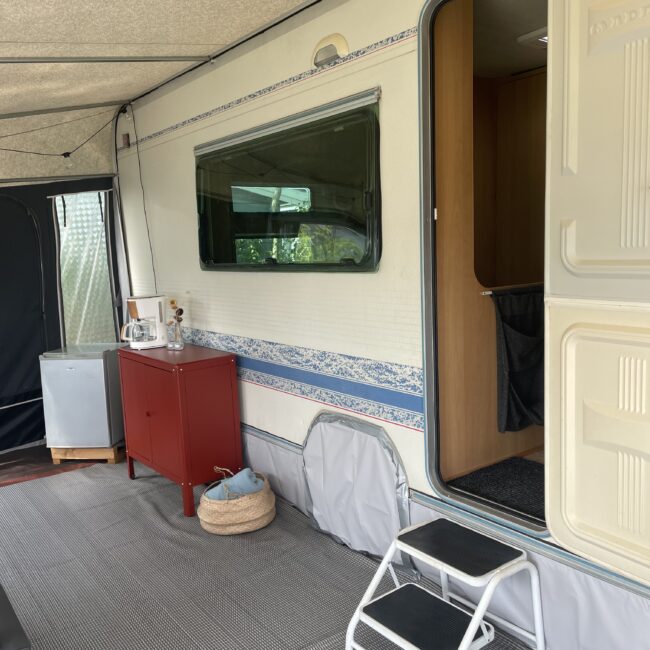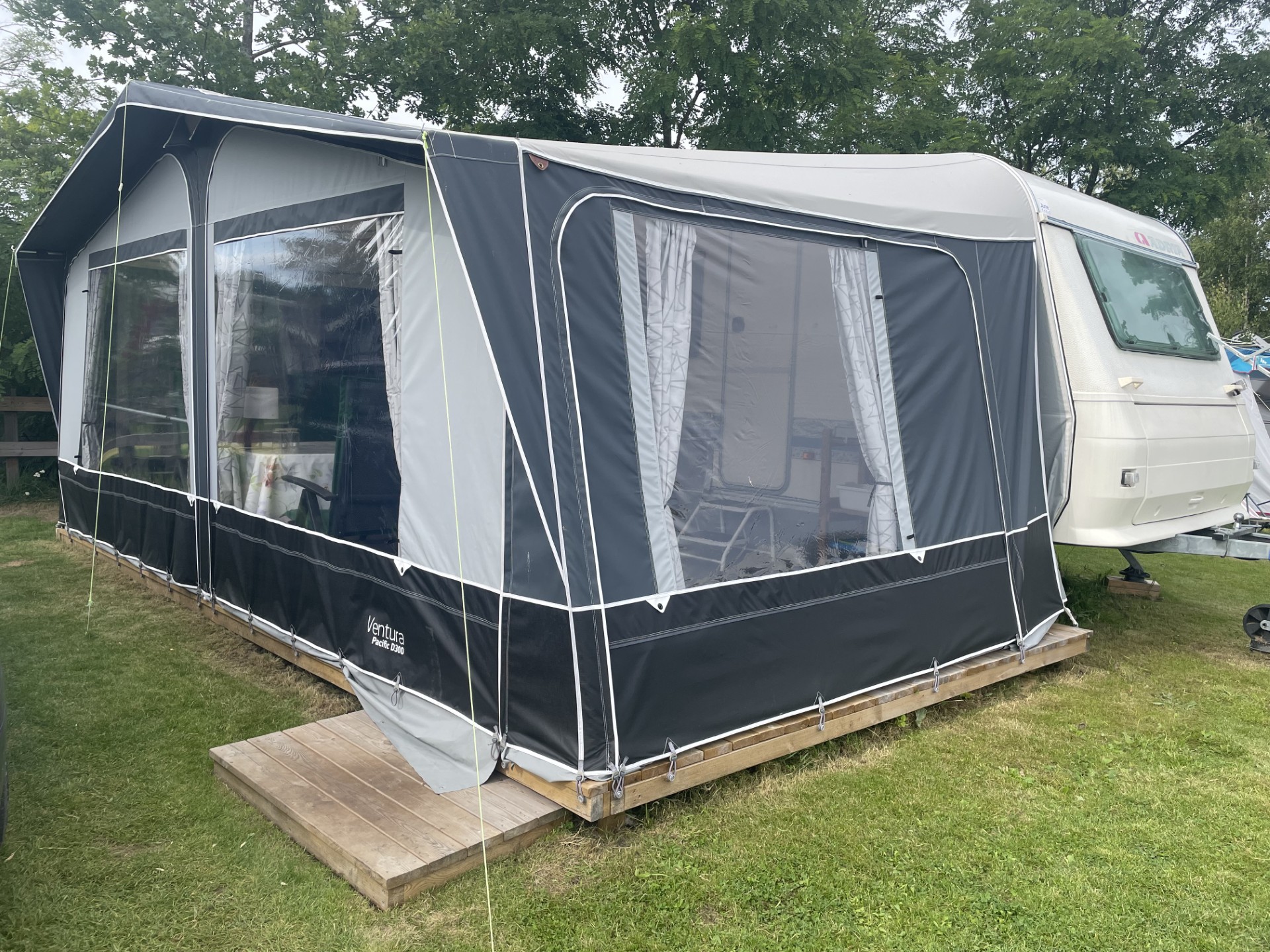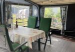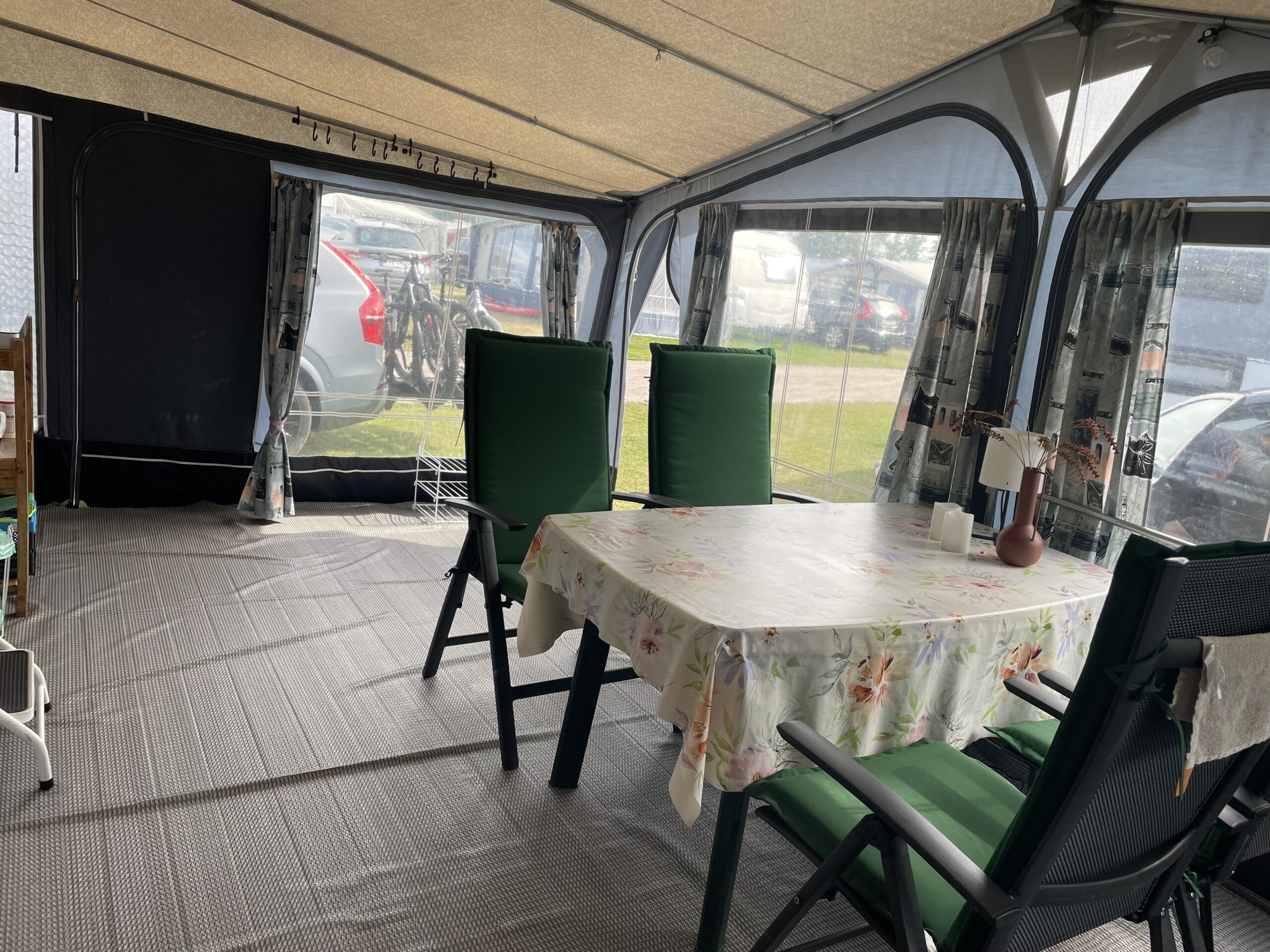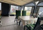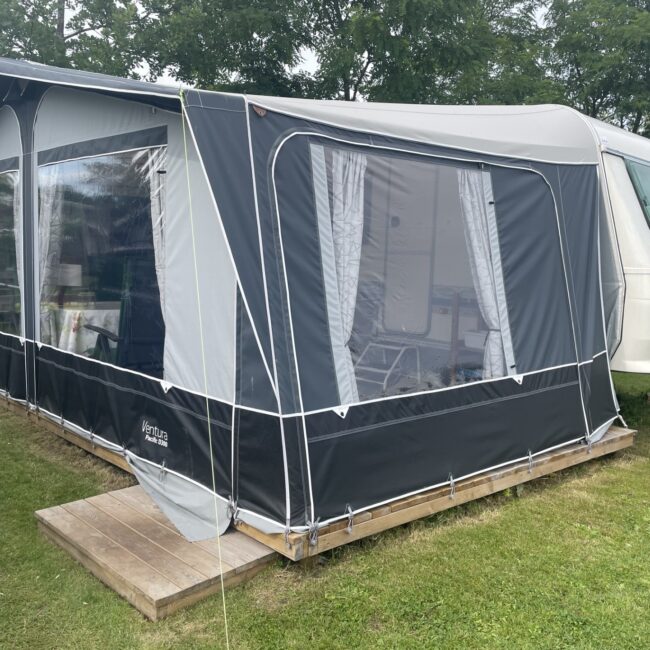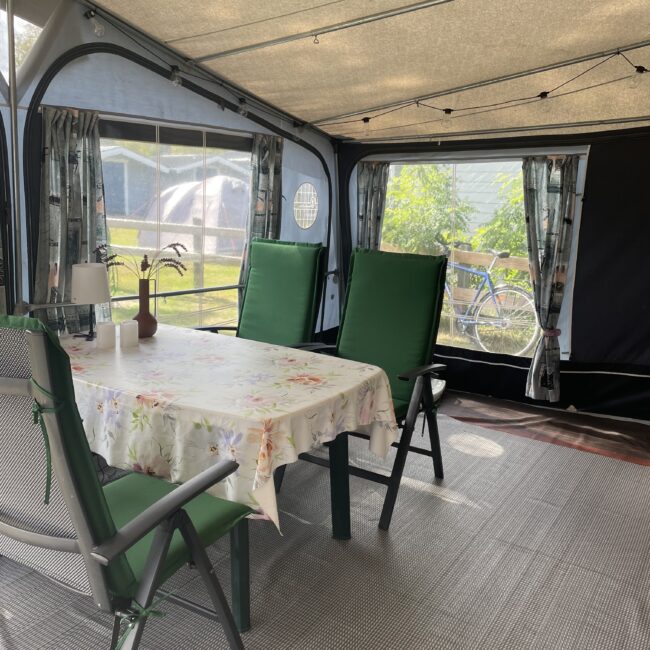 Rymligt förtält som står på stabil trall. Där finns sittgrupp, induktionsplattor, kaffebryggare, dubbla kylskåp, värmefläkt. Mikrovågsugn finns i husvagnen.