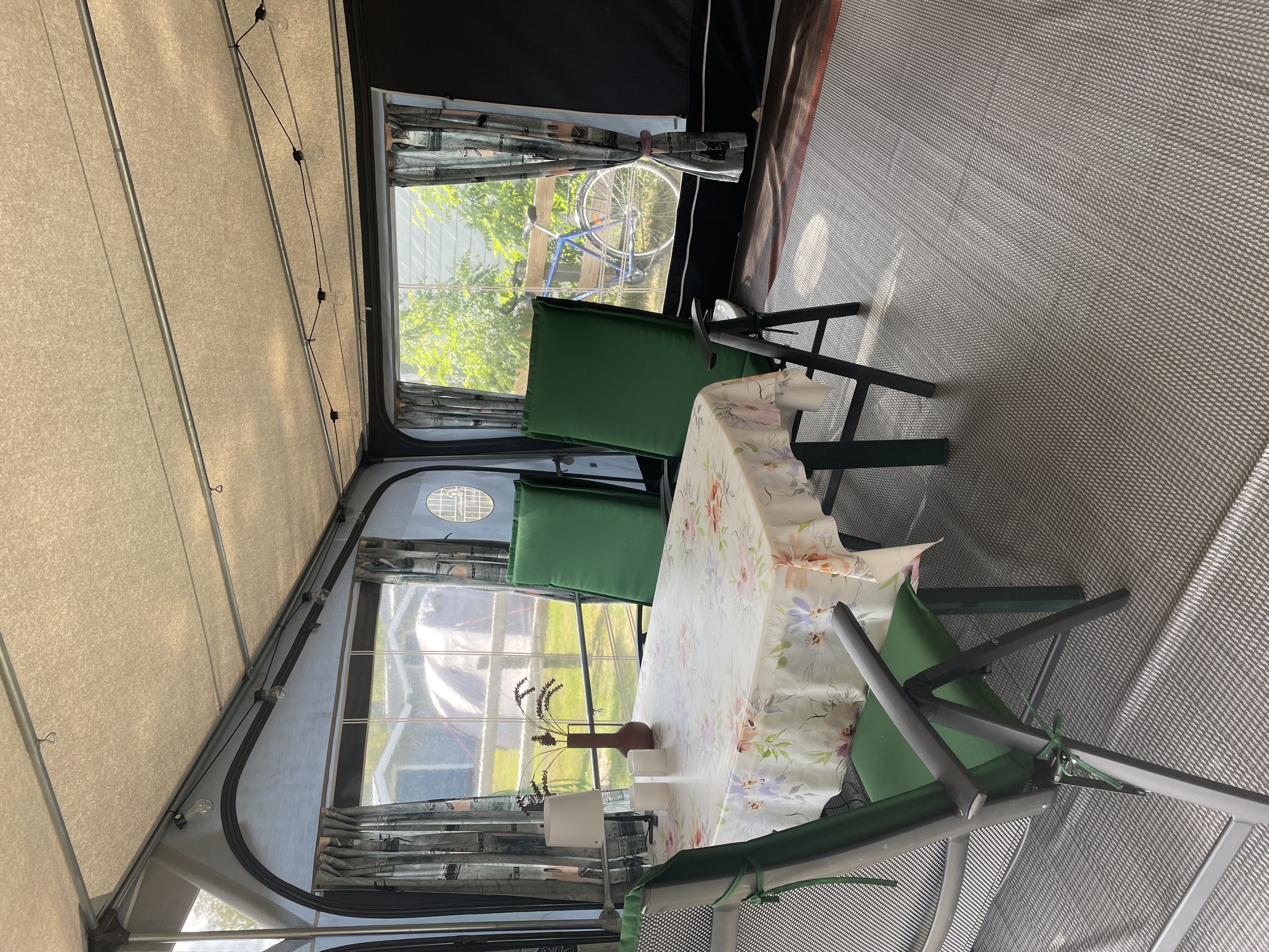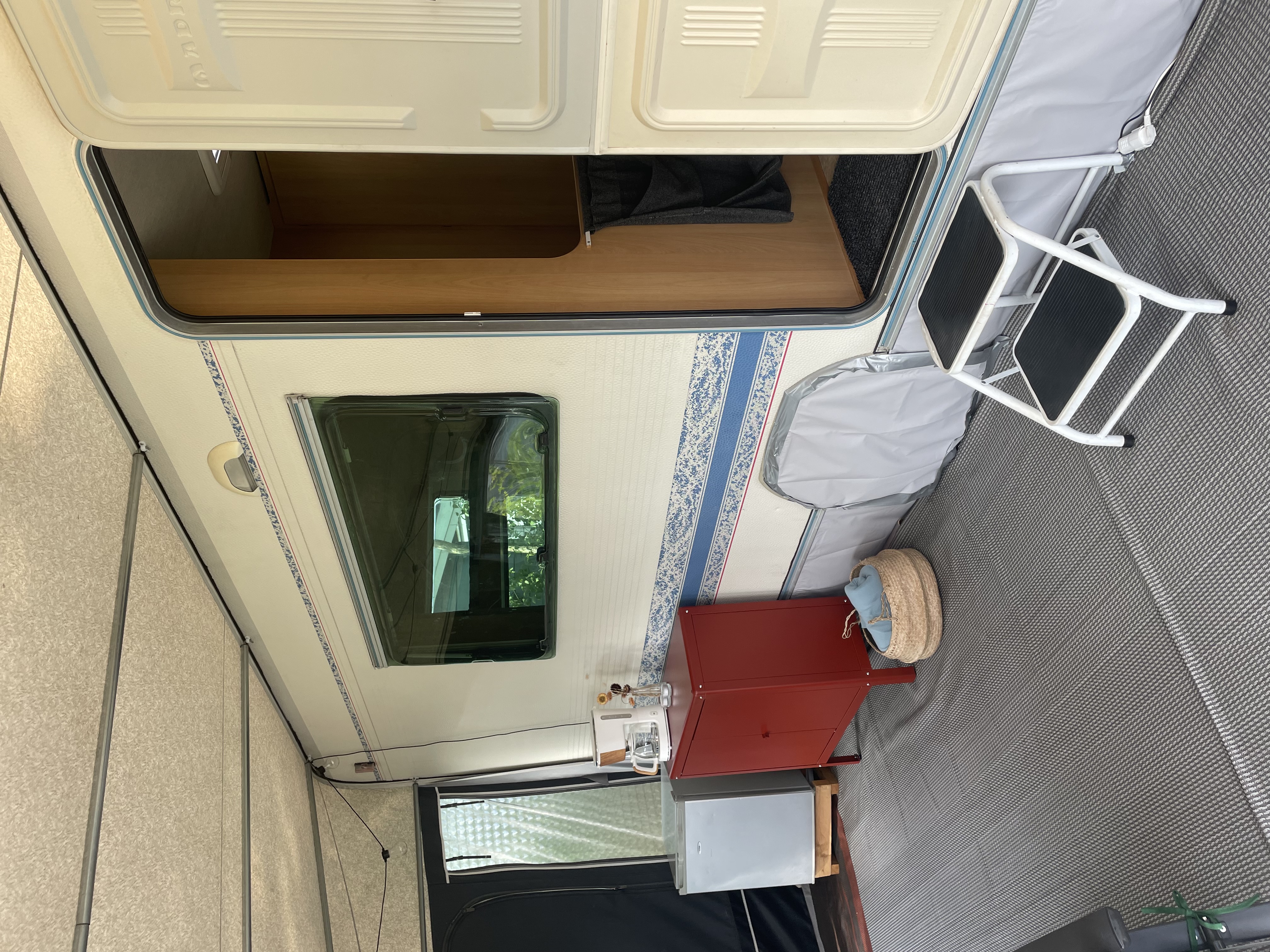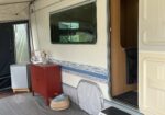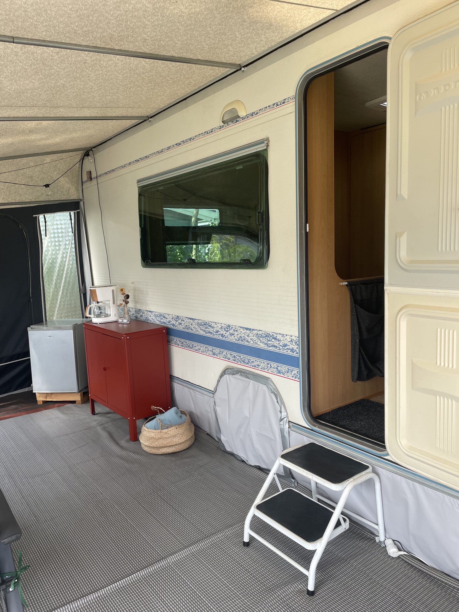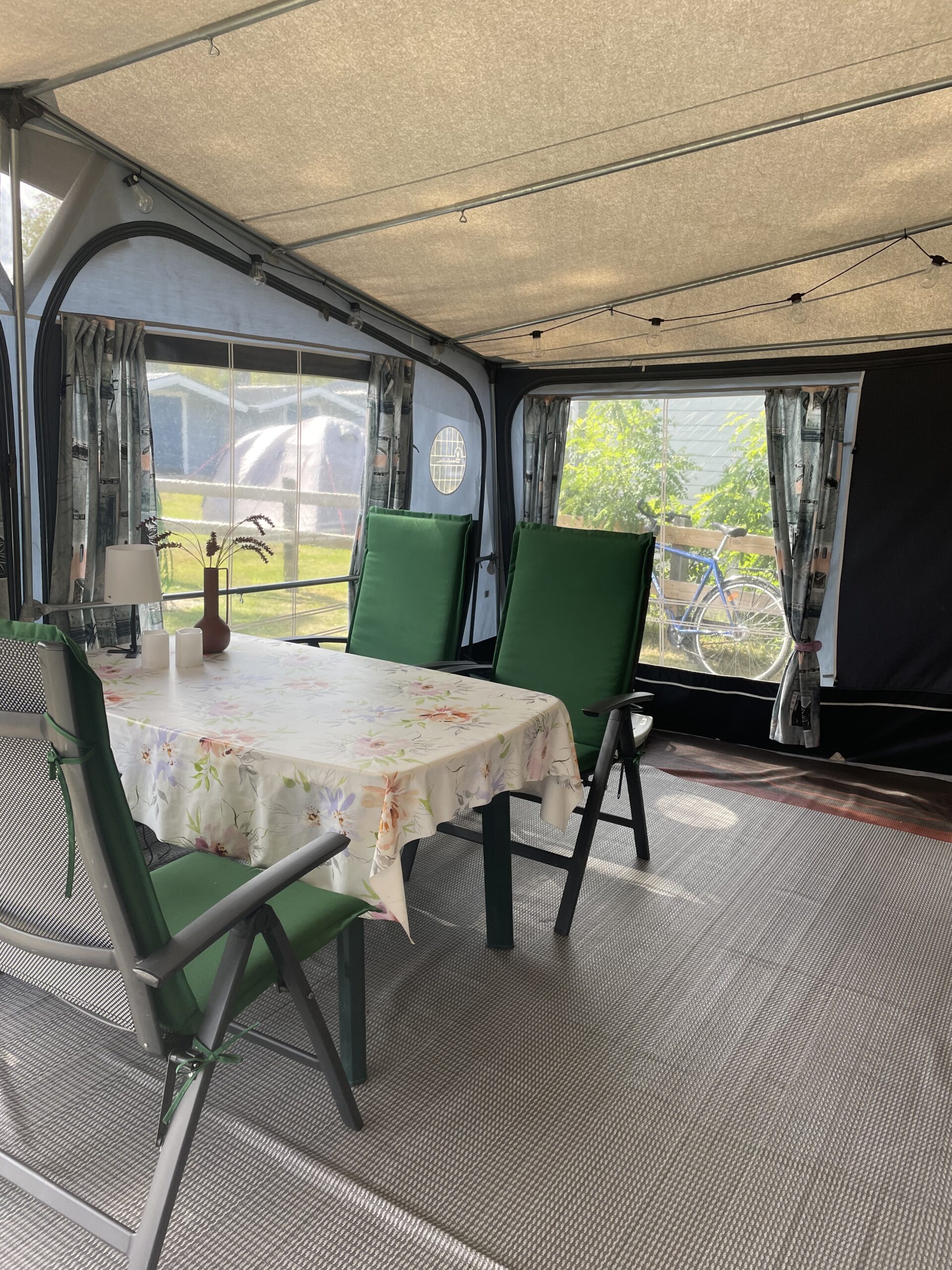 Rymligt förtält som står på stabil trall. Där finns sittgrupp, induktionsplattor, kaffebryggare, dubbla kylskåp, värmefläkt. Mikrovågsugn finns i husvagnen.