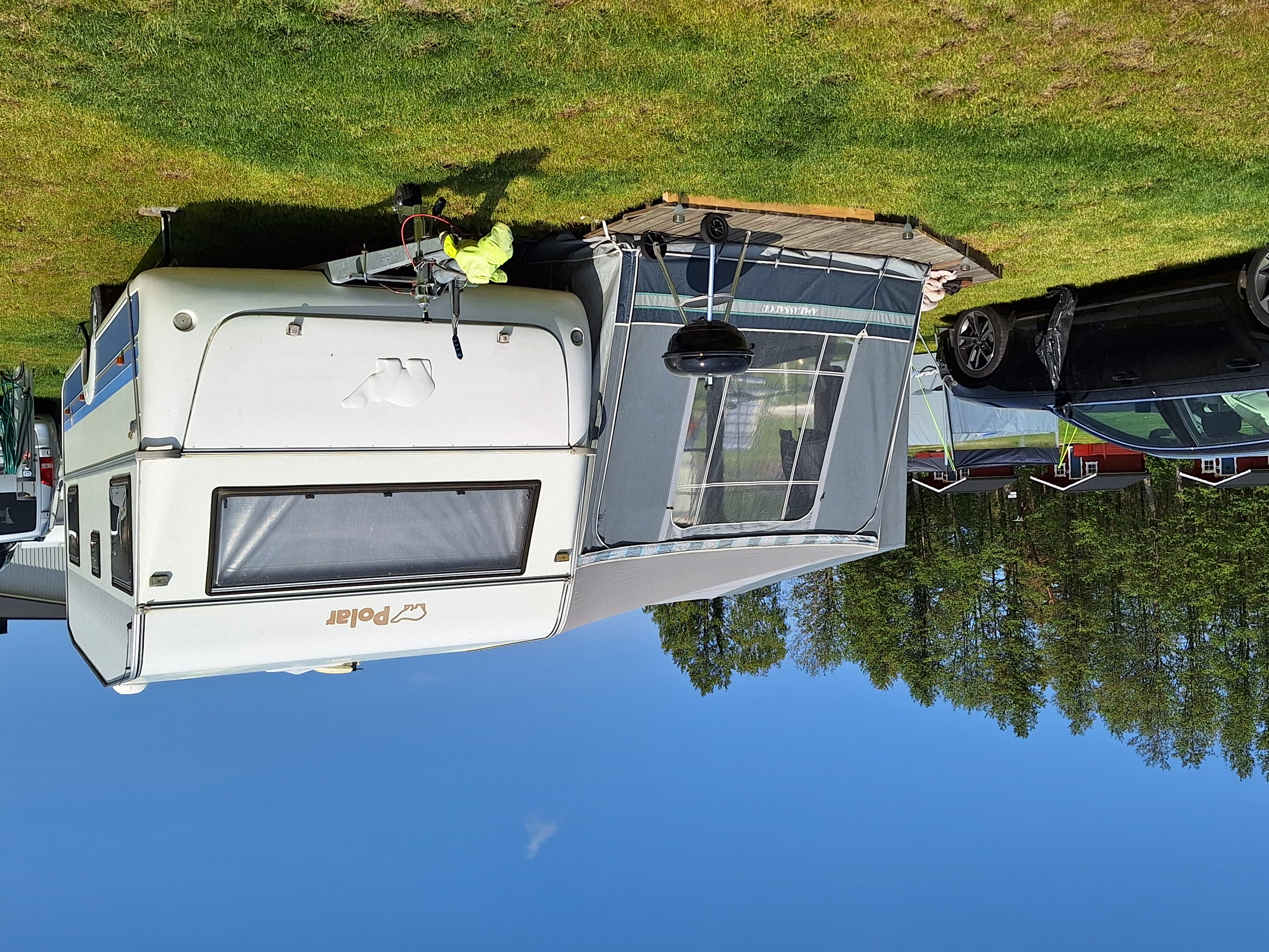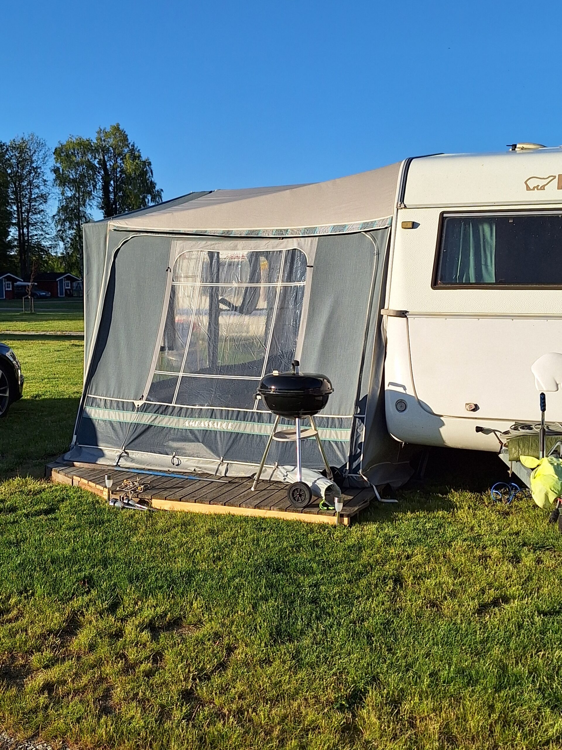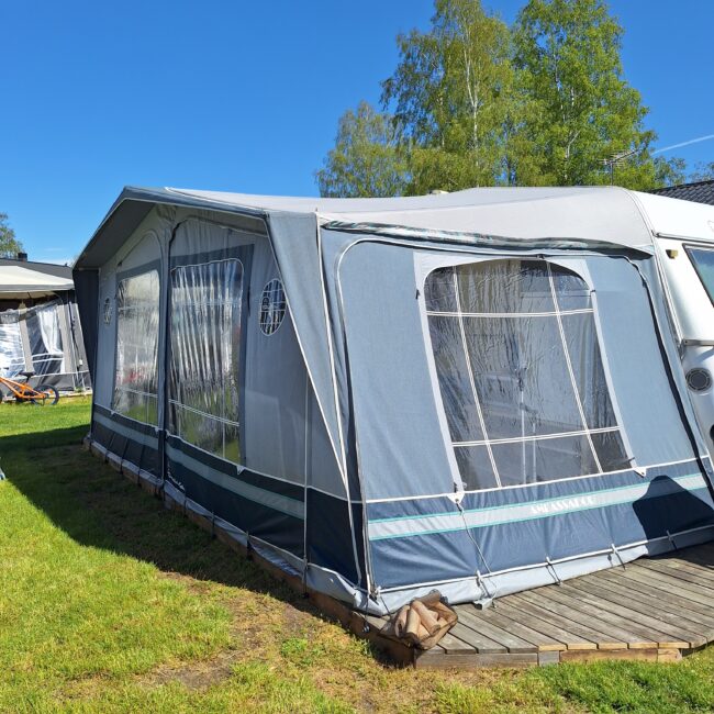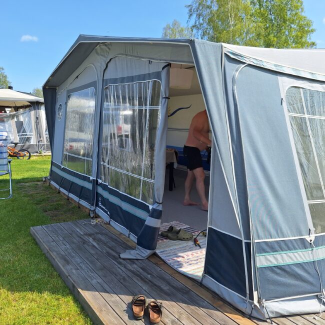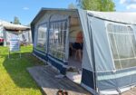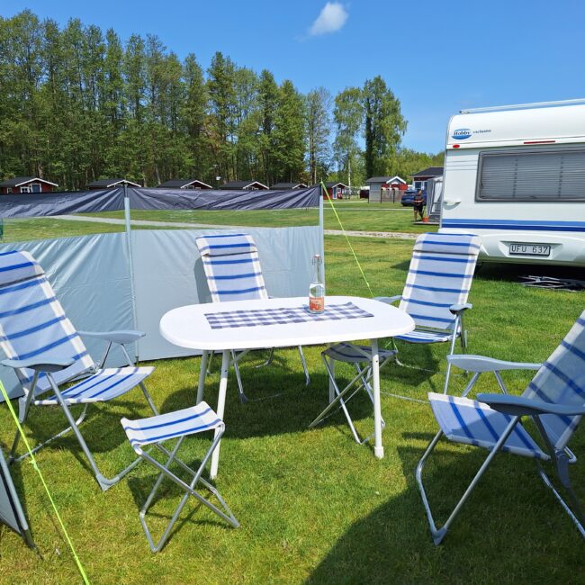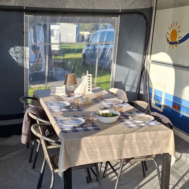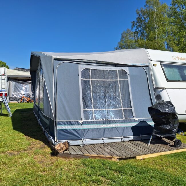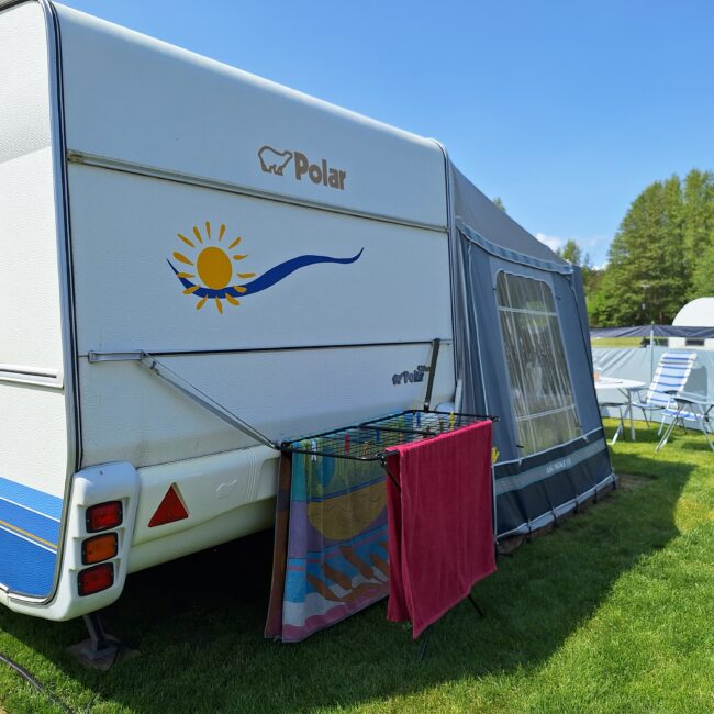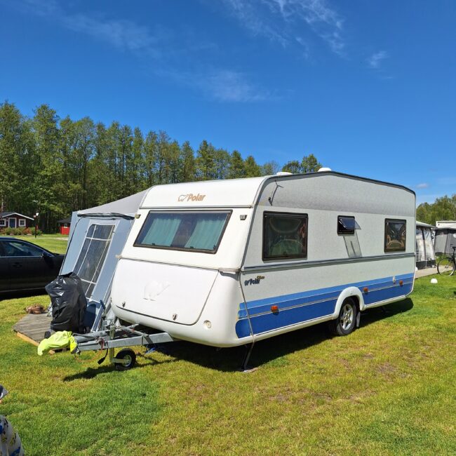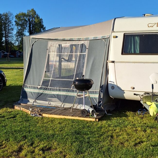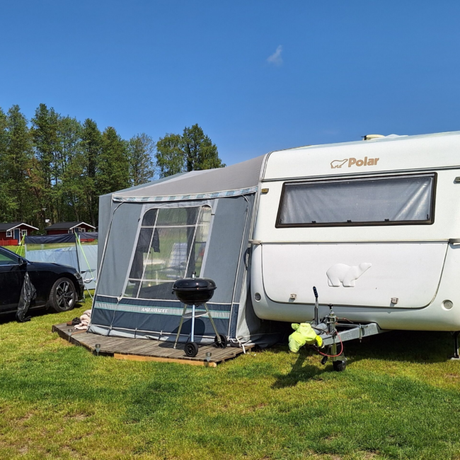 Vår husvagn finns på Fröjden med kvällssol och I närhet till servicehus och lekplats.