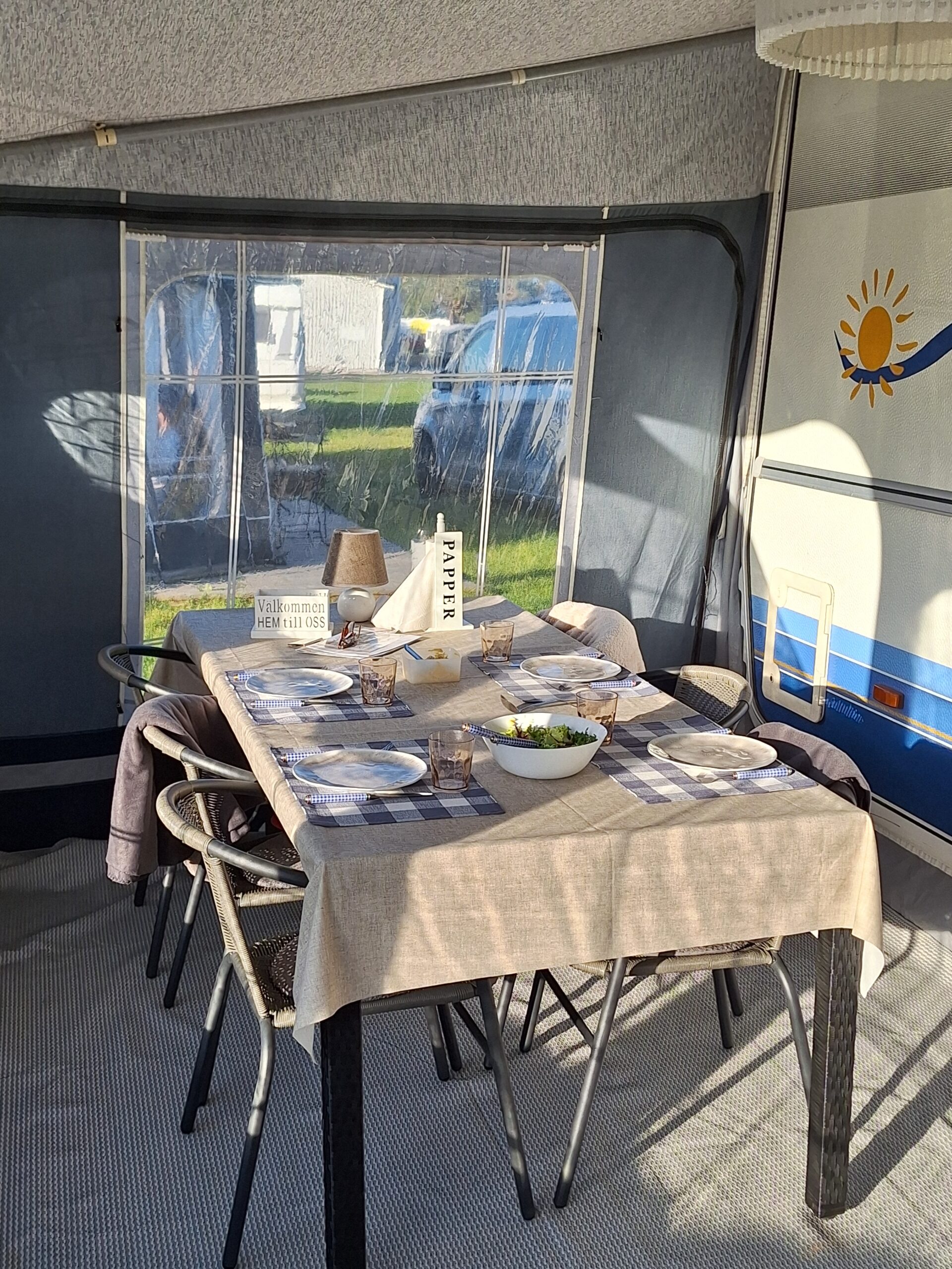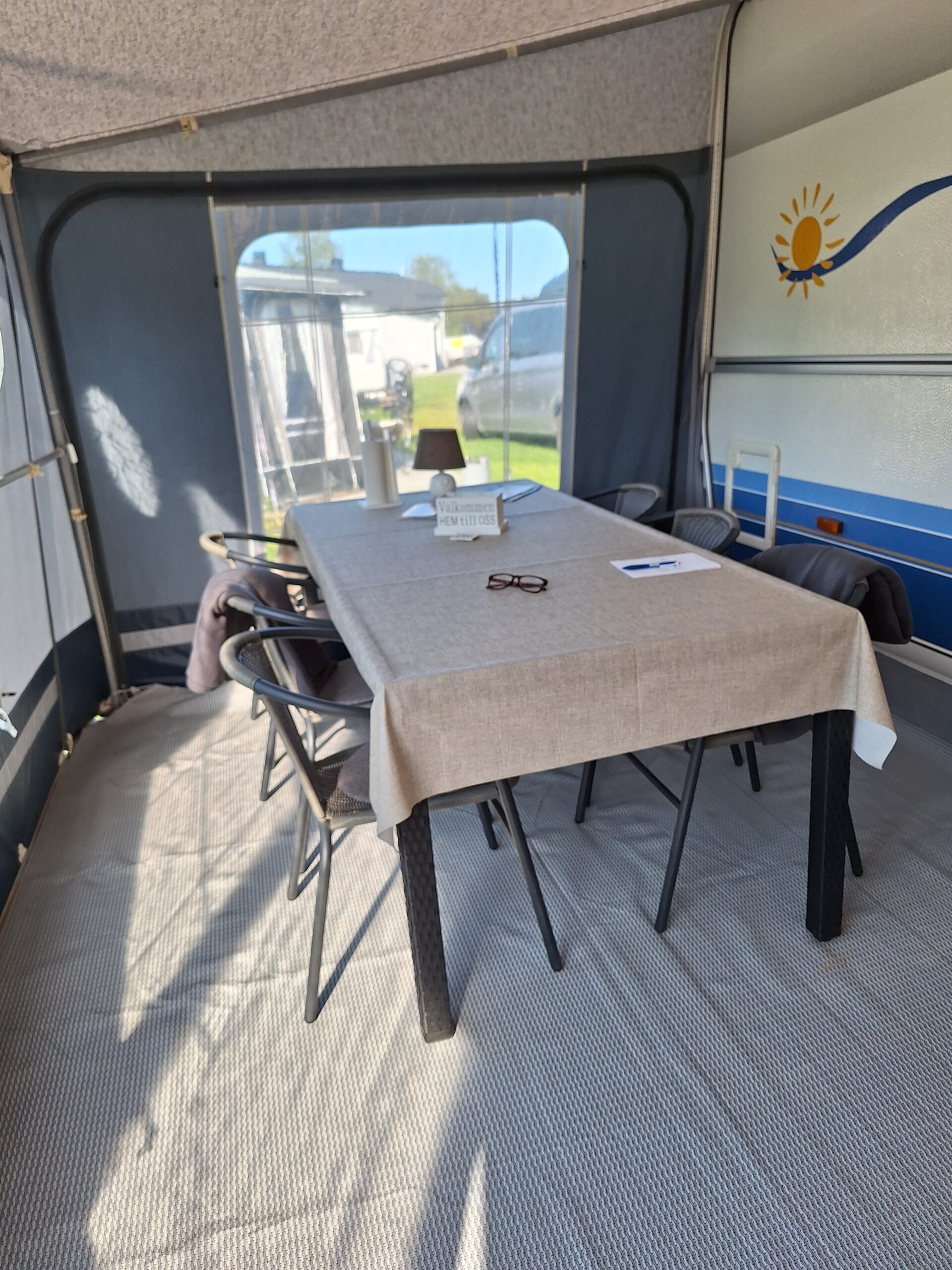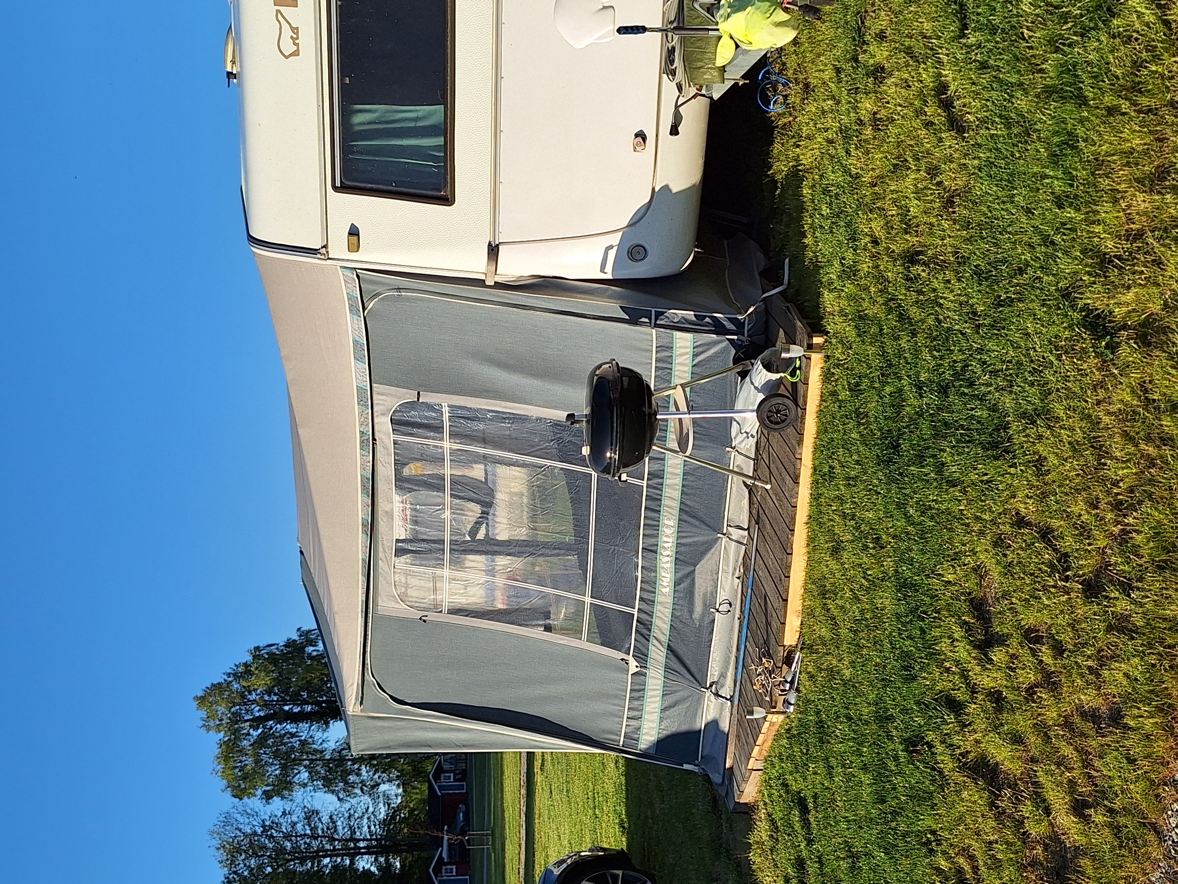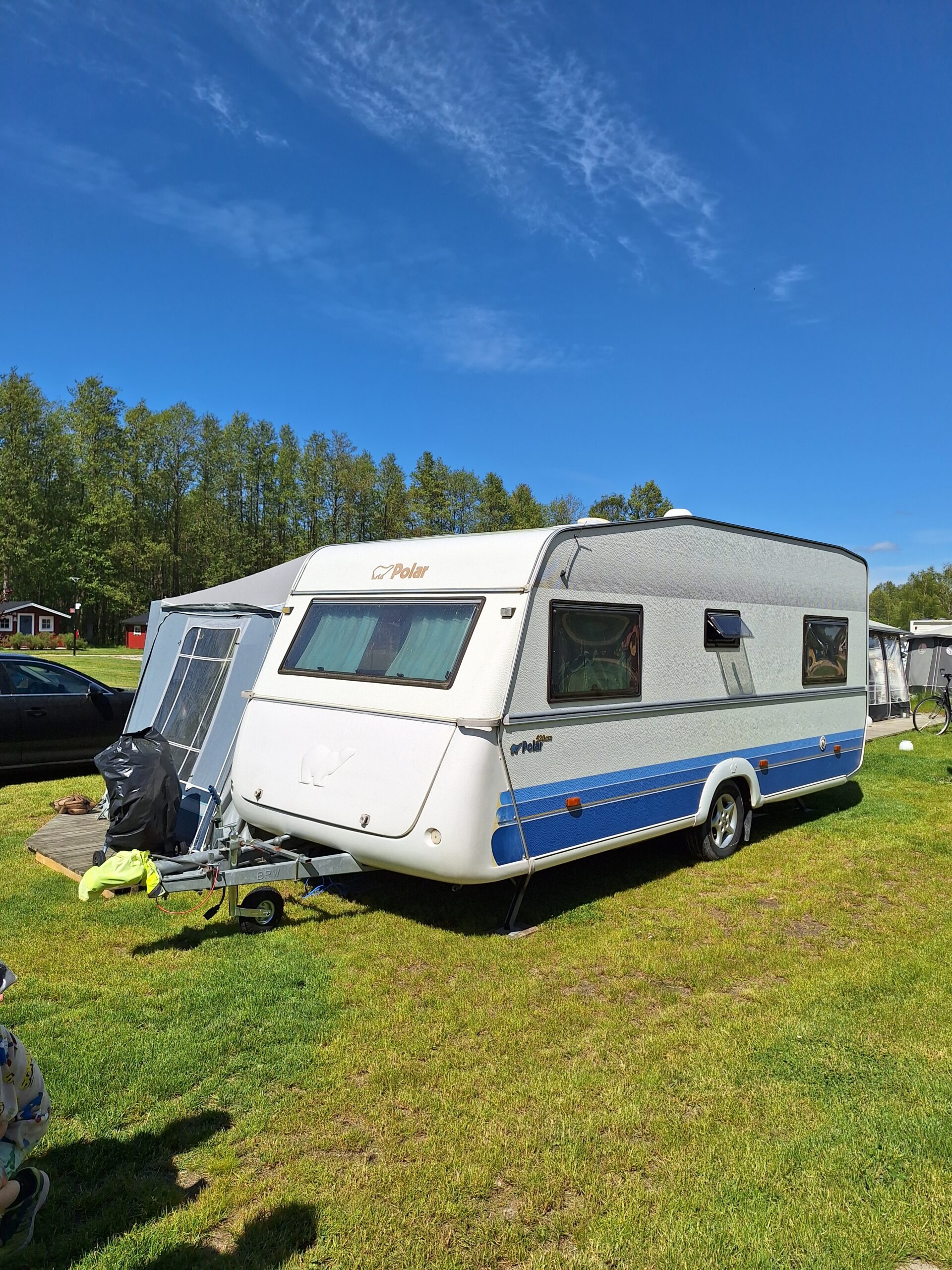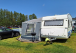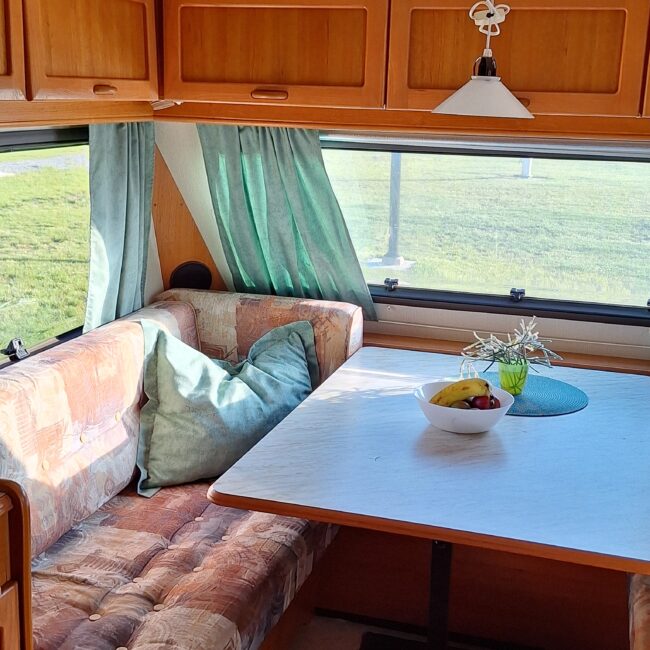 Vår husvagn finns på Fröjden med kvällssol och I närhet till servicehus och lekplats.