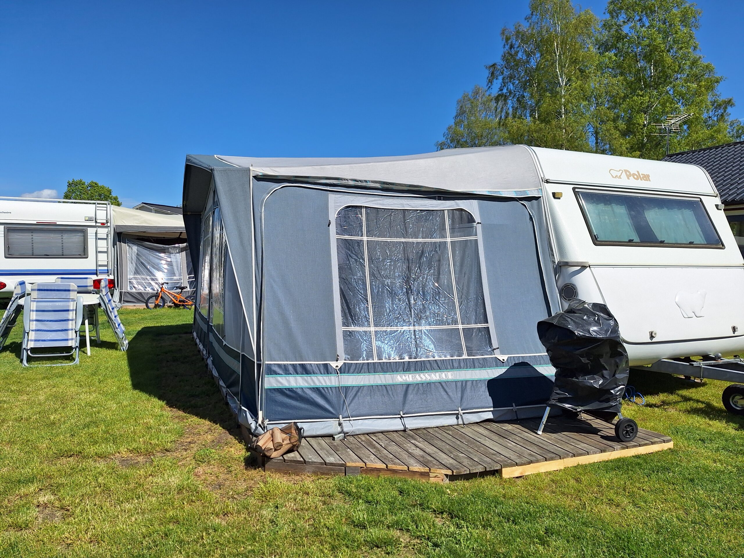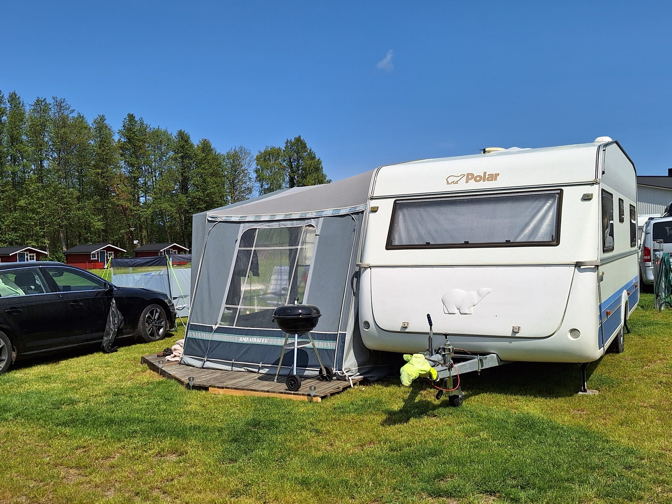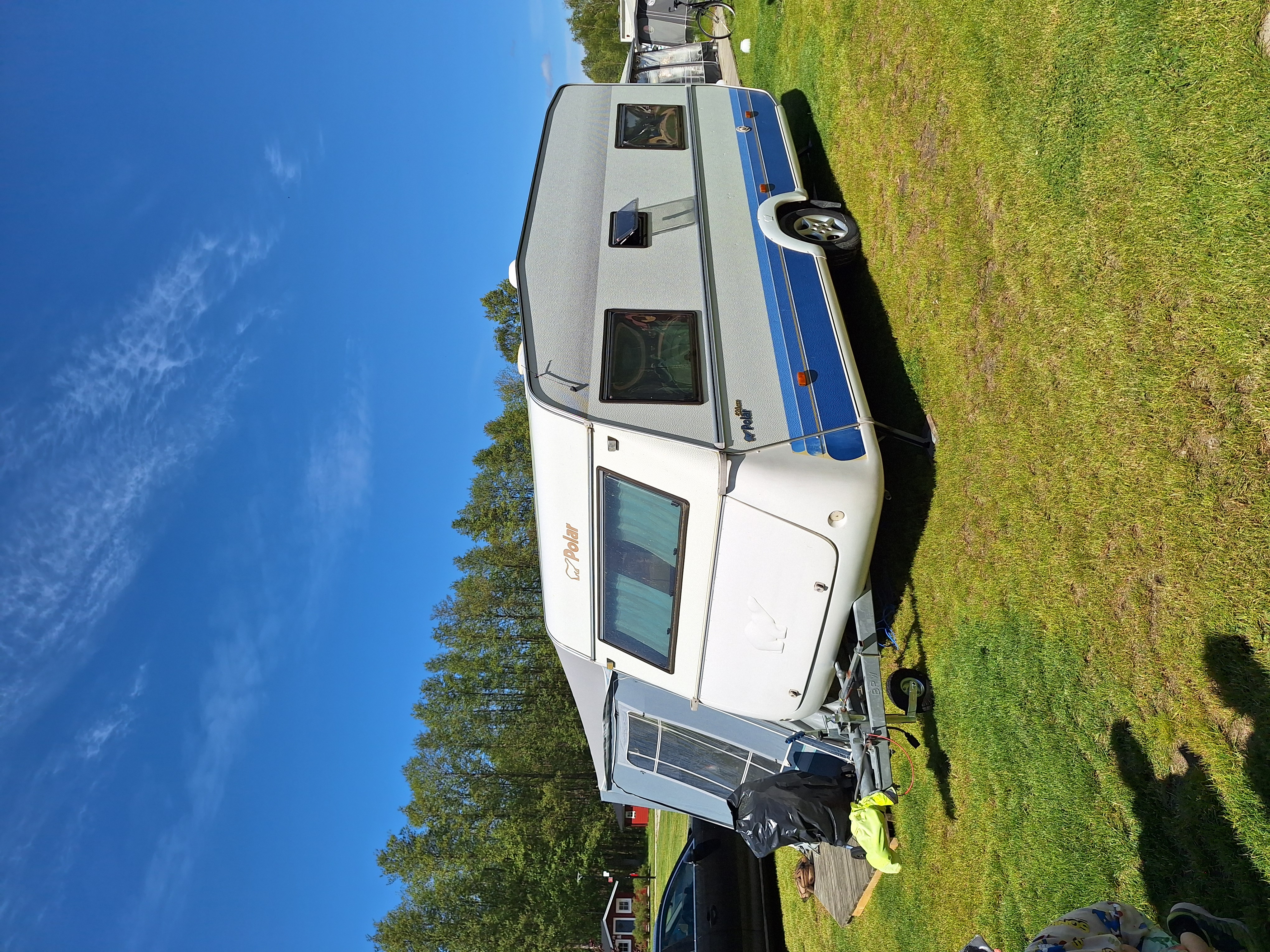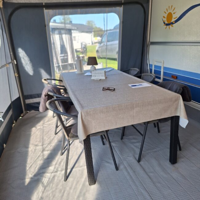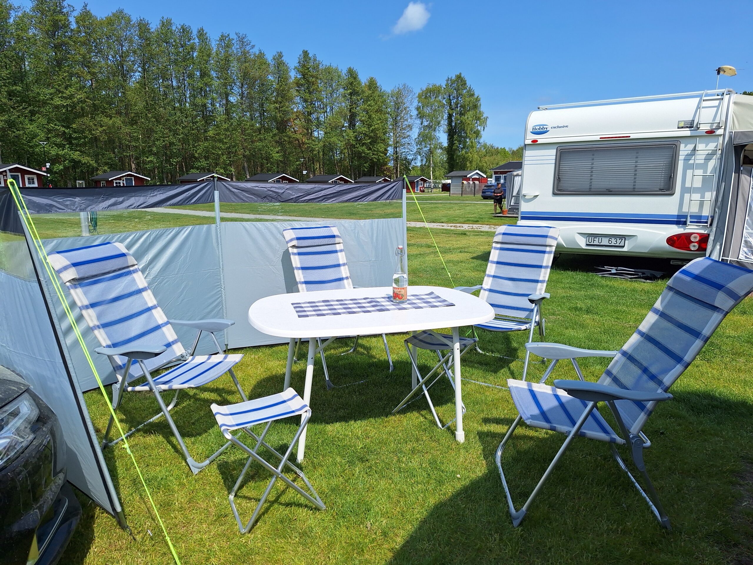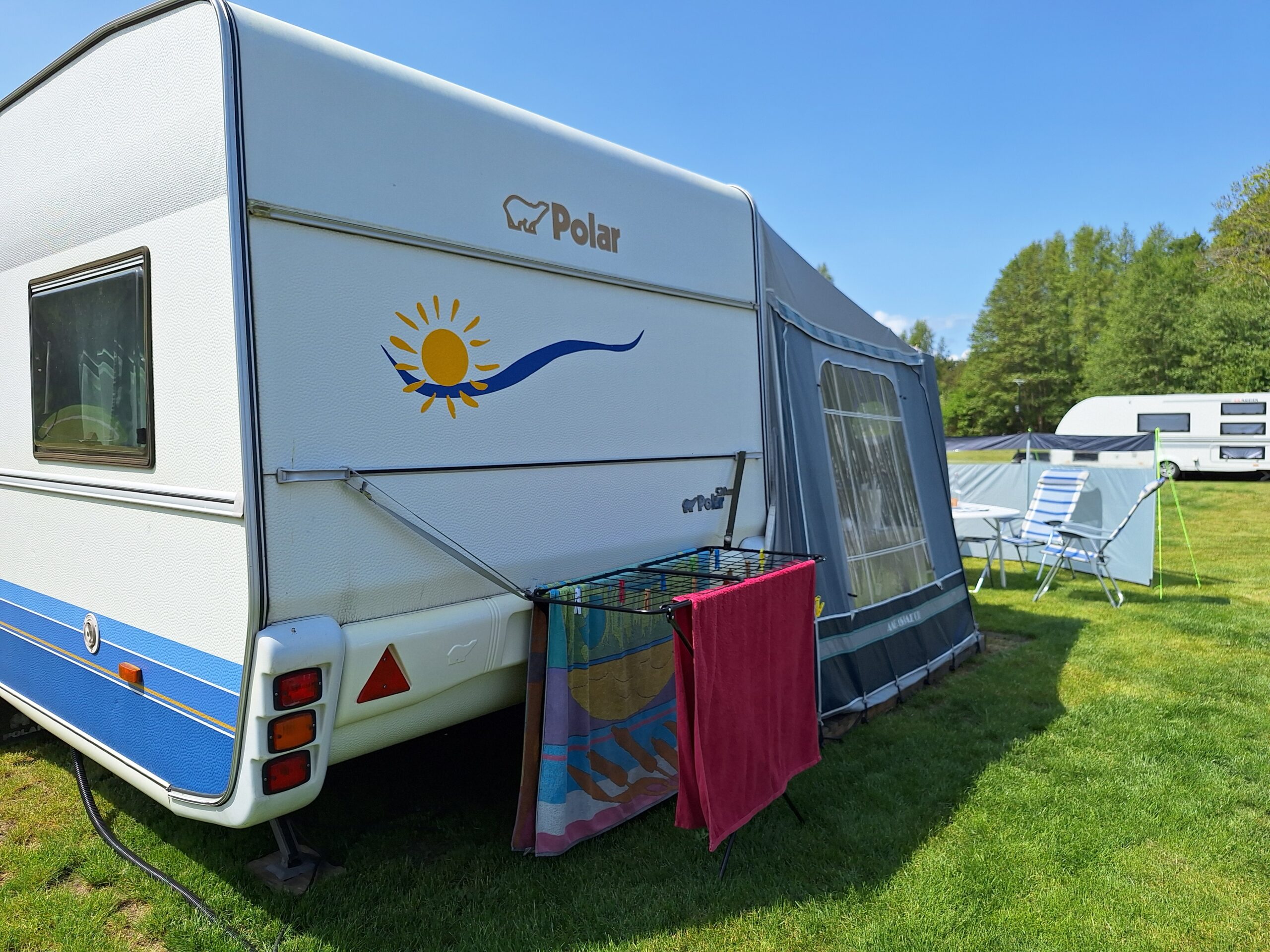 Vår husvagn finns på Fröjden med kvällssol och I närhet till servicehus och lekplats.